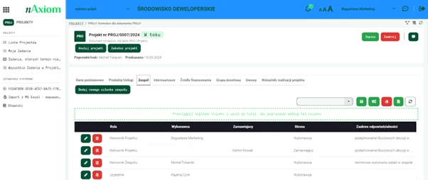 The project card view in the nAxiom application is a central place where all key information regarding the implemented project is collected. The user can easily review the project details, such as its name, description, vision and goals. Thanks to this, the project card becomes a transparent tool facilitating the management and monitoring of the work progress.