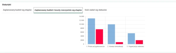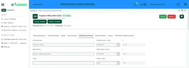 The application enables project finance management by tracking financing sources. Users can compare the planned and actual budget at different stages of the project and analyze costs using visual charts and reports. Automatic calculation of the percentage share of individual financing sources facilitates budget control. The financial management module allows for detailed monitoring of the budget and financing sources, such as: