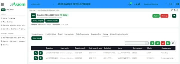 The details visible on the screen include, among others, project implementation dates – start and end dates, which allow for precise planning and monitoring of the schedule. Additionally, information about contractors and ordering parties has been included, which ensures clarity in the division of responsibilities.