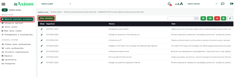 Po skonfigurowaniu czynności przetwarzania użytkownicy aplikacji do zarządzania ryzykiem nAxiom mają możliwość przypisania konkretnych zagrożeń do odpowiednich czynności przetwarzania informacji. Uczestnicy analizy mogą korzystać z wcześniej zdefiniowanych słowników, które zawierają różne rodzaje zagrożeń, takie jak ataki cybernetyczne, awarie sprzętu, błędy ludzkie czy zagrożenia związane z fizycznym dostępem do danych. Każde zagrożenie można sklasyfikować według specyfiki działalności firmy, co pozwala na dokładniejsze monitorowanie i zarządzanie potencjalnymi ryzykami.