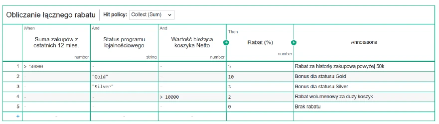 Widzimy tabelę decyzyjną Obliczanie łącznego rabatu, która jest częścią modelu decyzyjnego DMN. W skład modelu wchodzi zawsze przynajmniej jedna taka tabela (może być ich więcej, gdy decyzje powinny być podejmowane w sposób hierarchiczny, a decyzja końcowa zależy od decyzji składowych).