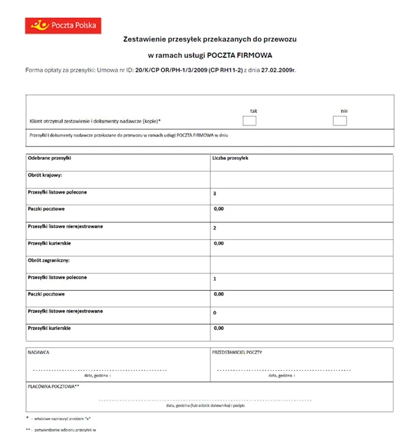 Podsumowanie przesyłek w postaci elektronicznej jest gotowe do druku, co znacznie usprawnia przekazywanie dokumentów pocztowych.