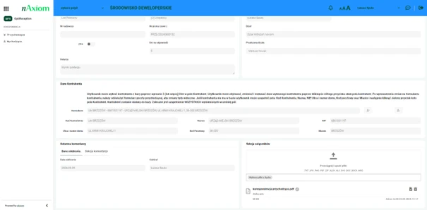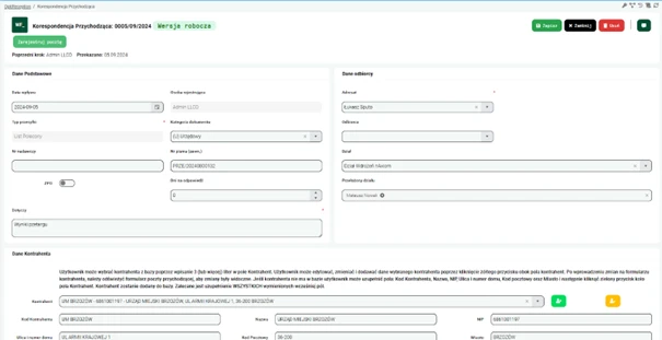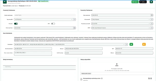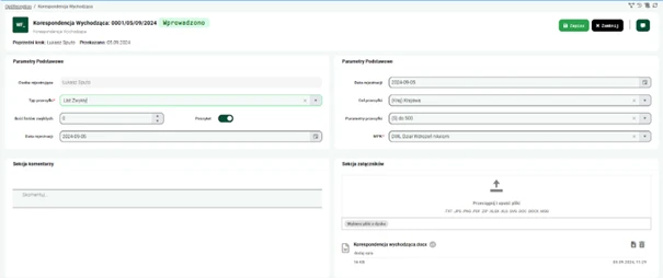 Aplikacja pozwala na załączanie dokumentów oraz ich podgląd bezpośrednio z poziomu systemu, co ułatwia śledzenie i analizowanie korespondencji. Użytkownicy mogą przeglądać załączniki, dodawać notatki oraz współpracować nad dokumentami w czasie rzeczywistym.