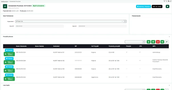 Jedną z kluczowych funkcji aplikacji jest możliwość generowania zestawień dla operatorów pocztowych. System automatycznie tworzy raporty na podstawie przesyłek, które zostały zarejestrowane w systemie, co znacznie usprawnia proces zarządzania wysyłkami.