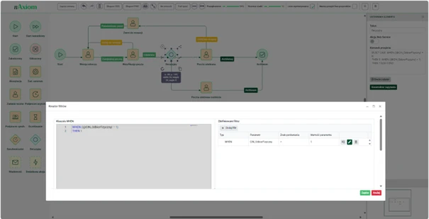W edytorze workflow użytkownik definiuje warunki decyzyjne, które determinują dalszy los dokumentów w systemie. Konstruktor zapytania umożliwia tworzenie złożonych zależności między polami formularzy a działaniami systemu.