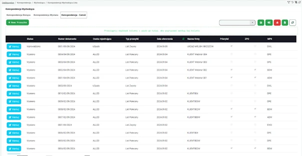 Aplikacja generuje pełne raporty dotyczące zarówno poczty przychodzącej, jak i wychodzącej, co umożliwia administratorom łatwe monitorowanie stanu dokumentów. Z poziomu interfejsu można przeglądać statusy, szczegóły dotyczące poszczególnych przesyłek oraz przypisanych użytkowników.